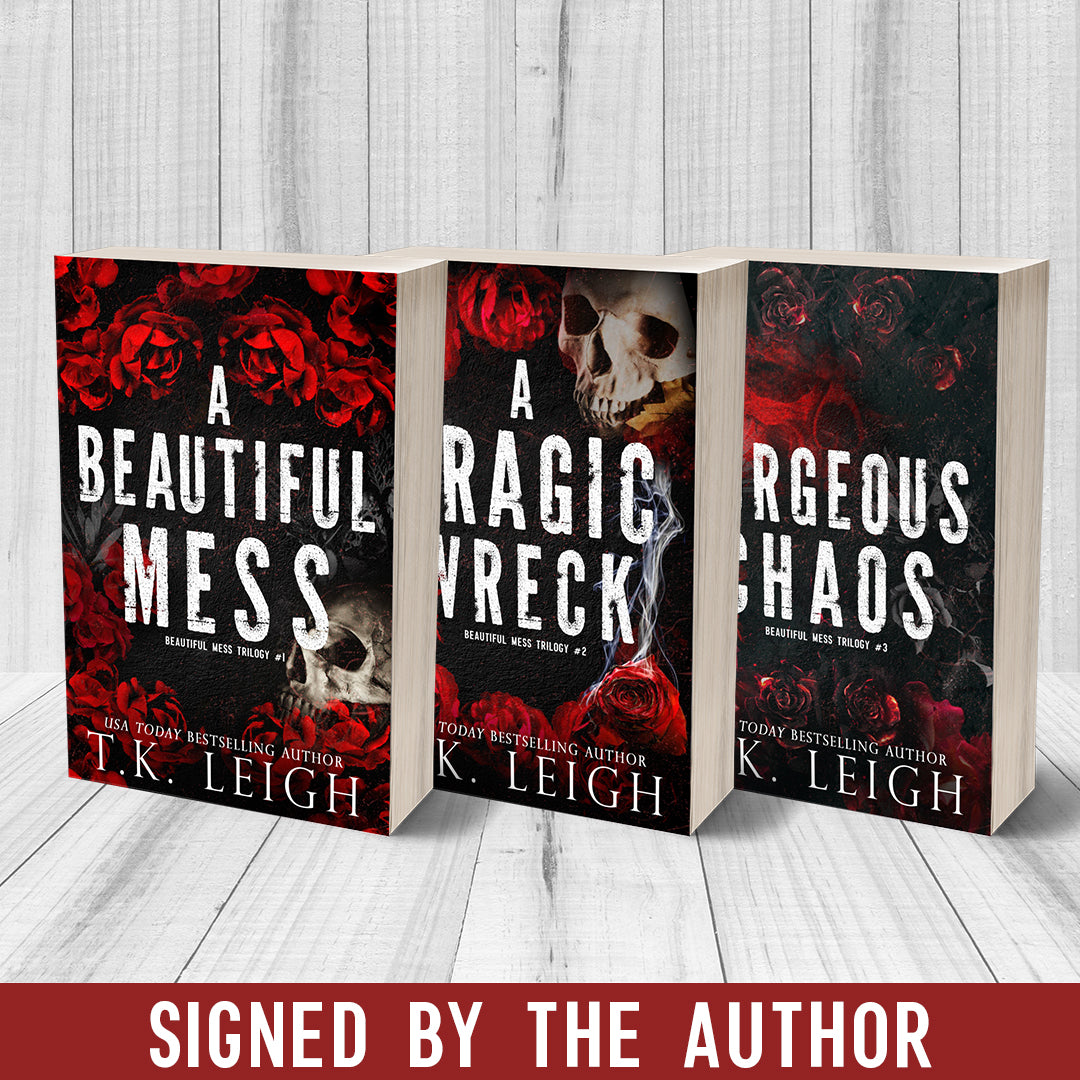 This bundle includes signed discreet edition paperbacks of all three books in the USA Today Bestselling Beautiful Mess Trilogy: A Beautiful Mess (Book One), A Tragic Wreck (Book Two), and Gorgeous Chaos (Book Three).