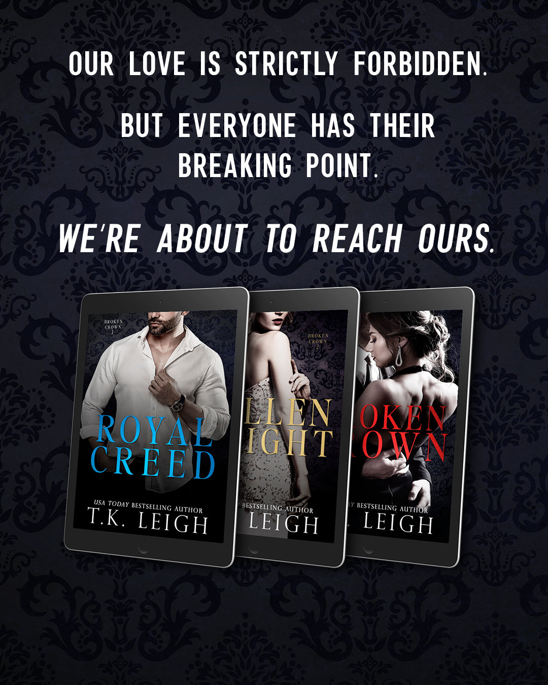 Get more bang for your buck by grabbing the entire collection of royal romances by T.K. Leigh! This includes the Broken Crown Trilogy as well as Royal Games and Tangled Games, which is an interconnected duology to the Broken Crown Trilogy. Get your royal binge on today!